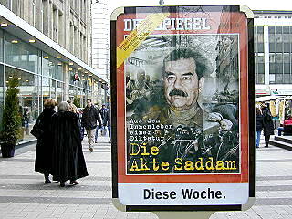 Im Spiegel-Artikel vom 3.2.2003 mit dem Titel "Akte Saddam (II) - 'Der gefährlichste Mann der Welt'", heißt es: "Im März 1987 ernannte Saddam seinen mörderischen Cousin Ali Hassan al-Madschid zum Gouverneur des Nordirak. Am 16. März 1988 unternahm Ali Hassan seinen berüchtigten Überfall auf die kurdische Stadt Halabdscha. Er setzte verschiedene chemische Kampfstoffe ein und tötete mindestens 5000 kurdische Zivilisten..." Auf der Titelseite des 'Spiegel' vom 27.1.2003, das sich auch als Werbeträger überall im deutschen Stadtbild wiederfindet, wird diese Darstellung durch ein Bild aus Halabja, das in die Montage eingebaut ist, unterschwellig illustriert - ohne Quelle und Zusammenhang des Bildes zu benennen.