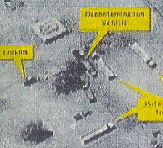 Bildunterschrift: Dieses US-Satellitenfoto vom 10. November soll den Abtransport von Raketen aus einer Testanlage in Al-Mussayyib kurz vor einer UNO-Inspektion zeigen. Zu erkennen ist die mit massiven Betonwällen gesicherte Einrichtung, in der Raketenrümpfe (airframes), Behälter für Gefechtsköpfe (warhead canisters) sowie Behälter für Raketen (missile storage canisters) lagern." |