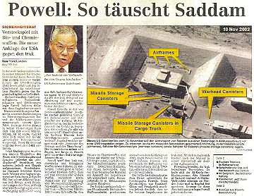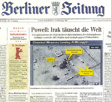 | 'Berliner Zeitung' - Titelseite vom 6.2.2003 "Powell: Irak täuscht die Welt - USA präsentieren im Sicherheitsrat Informationen der Geheimdienste, Saddam verstecke ABC-Waffen und verstoße gegen UN-Resolution" |