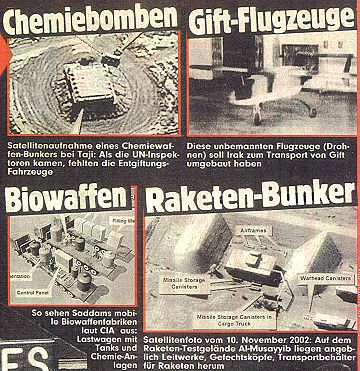 | 'Bild' - Seite 2 vom 6.2.2003 (Ausschnitt) "Chemiebomben - Gift-Flugzeuge - Biowaffen - Raketen-Bunker" |