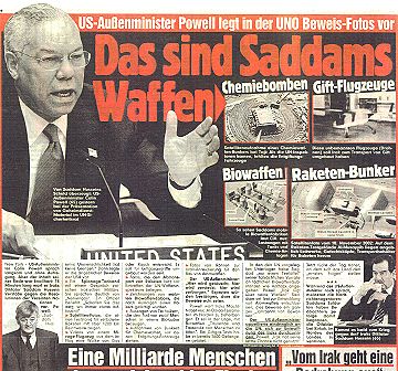 | 'Bild' - Seite 2 vom 6.2.2003 "US-Außenminister Powell legt in der UNO Beweis-Fotos vor - Das sind Saddams Waffen" |