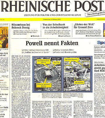| 'Rheinische Post' - Titelseite vom 6.2.2003 "Powell nennt Fakten - USA: Irak hat tonnen- weise Gift - 'Saddam im Bund mit al Qaida' - Briten: Lehrstück Hitler - Fischer will Beweise prüfen"