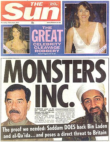 | 'Sun' - Titelseite vom 6.2.2003: "Monster-Gesellschaft - Der Beweis, den wir brauchten: Saddam unterstützt tatsächlich Bin Laden und al-Qa'ida ... und bildet eine direkte Bedrohung für Großbritannien"