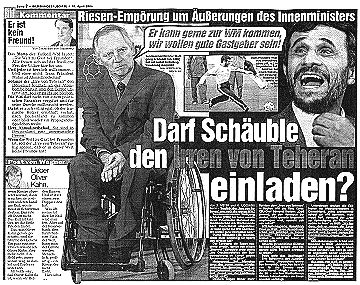 Der Irre von Washington Mit der 'taz' in Konkurrenz tritt die Bild-Zeitung. Sie kommt dabei allerdings nur auf den zweiten Platz. Denn bei ihr schafft es das Thema nur auf Seite 2. Dafür formuliert sie plumper. Im Kommentar der Bild-Zeitung heißt es unter dem Titel 'Er ist kein Freund!': "Das Motto der Fußball-WM lautet: 'Die Welt zu Gast bei Freunden'. Alle freuen sich auf das friedliche Fest der Völker hier bei uns. Und jeder ist herzlich willkommen – bloß einer nicht: Irans Präsident Mahmud Ahmadinedschad! Solange der 'Irre von Teheran' den Holocaust leugnet, an der Atombombe bastelt und den Terror unterstützt, soll er zu Hause bleiben." Auch sie schafft es spielend - wie die 'taz' - die Bedrohungssituation umzukehren. Wie einfach wäre es zu schreiben: Solange der 'Irre von Washington' den Holocaust instrumentalisiert, seine Atombomben im Iran zum Einsatz bringen will und die Welt mit Terror überzieht, soll er zu Hause bleiben. Und es wäre noch dazu um einiges richtiger.