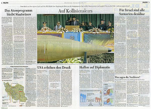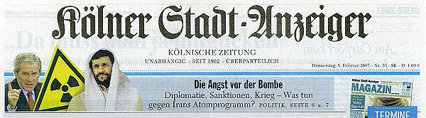 Am 8.2.2007 enthält der 'Kölner Stadt-Anzeiger' im Politik-Teil eine aufschlußreiche Doppelseite, in deren Mittelpunkt ein großes Bild von einer Militärparade im Iran steht. Die Bildunterschrift: 'Der Herr der Bombe...'. Die 'Bombe' ist im weit verbreiteten und hier verwendeten Vokabular die Atombombe. Und mit 'Herr', von dem hier die Rede ist, ist eindeutig Irans Präsident Mahmud Ahmadinedschad gemeint. Er ist derjenige, der hier angegriffen werden soll. Überschrieben ist das Bild mit 'Auf Kollisionskurs', als wäre es der Iran, der auf einen Krieg zusteuert. Wir fragen uns: wer steht hinter dieser entstellenden Propaganda?