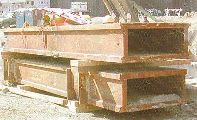 | Für den Abtransport vorbereitete Stahlsäulen aus dem Kern der Türme (regenerierte Aufnahme vom 3.10.2001) |