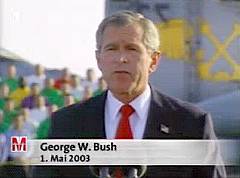 | US-Präsident George W. Bush am 1. Mai 2003: "Die Schlacht im Irak war ein Sieg im Kampf gegen den Terrorismus, der am 11. September begonnen hat. Die Befreiung des Irak war ein entscheidender Schritt im Kampf gegen den Terror. Wir haben einen Verbündeten von Al Quaida beseitigt. Und eine Finanzierungsquelle des internationalen Terrorismus trocken gelegt." |