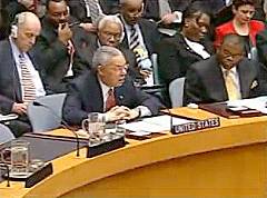 | Auch US-Außenminister Powell kann - so die Monitor-Autoren - keine Beweise dafür vorlegen, daß Saddam Hussein für die Anschläge des 11. September verantwortlich ist, obwohl er das im Weltsicherheitsrat mit enormem propagandistischen Aufwand versucht.
