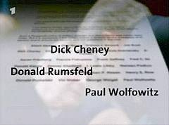 Das sind maßgebende Mitglieder des 'Project for a New American Century' (PNAC). Der Name dieser 'Verschwörer'-Gruppe ist - wie auch die Angabe des Jahres 2000 als Entstehungsjahr - für Zuschauer mit schneller Auffassungsgabe auf dem sich rasch durchs Bild bewegenden Dokument zu erkennen. |