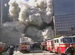 | Zu Bildern des in sich zusammenstürzenden World-Trade-Center-Südturms fragt 'Monitor': "Saddam Hussein, ein Alliierter von bin Laden und deshalb schuldig am Attentat auf das World Trade Center, wie der amerikanische Präsident behauptet?" Selbst die eigenen Geheimdienste der US-Regierung würden eine solche Unterstellung zurückweisen. |