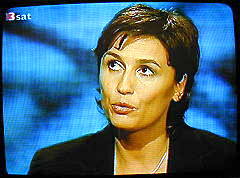| Maischberger: "... doch, das schreiben Sie wirklich... sind diese Gebäude gesprengt worden... Und das legt ja den Schluß nahe, daß das, wenn es von der CIA ausgeführt worden ist - wie Sie das sagen - daß das von George W. Bush für richtig geheißen wurde. Also nochmal die Frage: glauben Sie, der Mann ist ein Massenmörder?" (Bild)