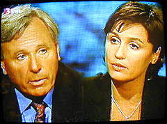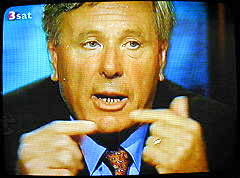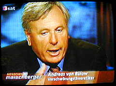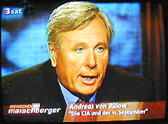 | Maischberger: "Herr von Bülow, ich unterbrech' Sie ja wirklich ungern... (Bild) nur... in Ihrem Buch... also... was ich jetzt gerade zitiert habe... schreiben Sie... mit aller Wahrscheinlichkeit, mit hoher Wahrscheinlichkeit sind die Flugzeuge ferngesteuert worden... nach allem, was Sie wissen und recherchiert haben..." |