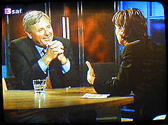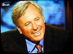 | Maischberger: "Gleich jetzt am Anfang ein Phänomen: übermorgen jährt sich der 11. September zum zweiten Mal, und es wuchern die Verschwörungstheorien, und die Leute glauben das. 20 Prozent der Deutschen sind fest davon überzeugt, daß die Vereinigten Staaten selbst die Anschläge angestiftet haben. Mein jetziger Gast hat genau dieses in einem Buch geschrieben, das mittlerweile auf Platz 3 der Spiegel-Bestsellerliste ist: der ehemalige SPD-Außenminister Andreas von Bülow." (Bild) |