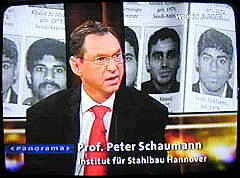 | O-Ton Prof. Peter Schaumann (Institut für Stahlbau, Hannover): "Soweit ich es beurteilen kann, ist die Qualität ihrer Recherche schlecht. Es ist in technischen Kreisen völlig klar - und das haben Sie auch in den Bildern gesehen, auch von dem Bau - es handelt sich um eine Stahlkonstruktion, und der Beton, von dem Sie sprechen, ist ausschließlich der Leitbeton in den Decken."