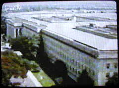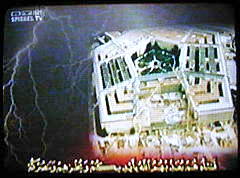 | Sprecherin: "Es folgt ein Foto des beschädigten Pentagon, unterlegt mit religiösen Gesängen und Koranversen, hergestellt von der Al-Qaida-eigenen Produktionsfirma Assahab..." |