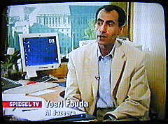 Anmerkung: Wer ist derjenige, der uns hier etwas über Al-Qaida erzählt? Yosri Fouda ist Chefkorrespondent des arabischen Fernsehsenders al-Dschasira. Er ist zusammen mit Nick Fielding, Chefreporter der 'Sunday Times', Autor des Buches 'Masterminds of Terror. Die Drahtzieher des 11. September berichten.' Darin verarbeitet er ein Interview, von dem er behauptet, es im April 2002 im pakistanischen Karatschi mit Ramzi Binalshibh und Chalid Scheich Mohammed geführt zu haben, die er als Drahtzieher und Planer der Anschläge vom 11. September bezeichnet. Sein Londoner Al-Dschasira-Büro liegt am Albert Embankment mit direktem Blick auf das Thames House am gegenüber liegenden Ufer der Themse, das Hauptquartier des britischen Geheimdienstes MI5 - wie in einer Besprechung des Buches im Deutschlandradio angemerkt wird. |