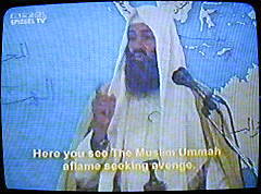 | Sprecherin: "Zitat bin Laden: Ich schwöre im Namen Allahs..., daß Amerika und jeder Amerikaner nie und nimmer sich sicher fühlen wird, solange bis wir in Palästina uns sicher fühlen und bis alle ungläubigen Mächte das Land des Propheten Mohammed verlassen haben." |