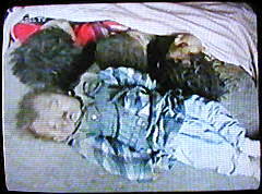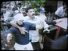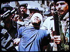 Anmerkung: Diese Szene zeigt angeblich die Verhaftung von Ramzi Binalshibh am 11.9.2002 in Karatschi. Ob es sich dabei tatsächlich um eine Person mit dem Namen Ramzi Binalshibh handelt, ist dem Bild und dem Spiegel-TV-Beitrag insgesamt nicht zu entnehmen. Und auch, ob die festgenommene Person irgendetwas mit den Anschlägen vom 11. September zu tun hat, wird nirgends in diesem Beitrag auch nur andeutungsweise plausibel gemacht. |