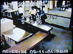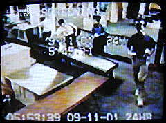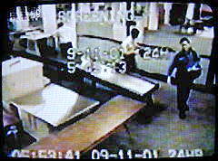 Anmerkung: Spiegel-TV ist sich offenbar der Schwierigkeiten mit diesen Bildern bewußt. Nach Angaben des FBI zeigen sie Mohammed Atta und Abd al Asis al-Umari am Morgen des 11. September 2001 auf dem Flughafen von Portland (Bild 1: 5:45:06 bzw. 05:53.34 Uhr, Bild 2: 5:45:11 bzw. 05:53.39 Uhr, Bild 3: 5:45:13 bzw. 05:53.41 Uhr, Bild 4: 5:45:15 bzw. 05:53.44 Uhr). Da die beiden angeblichen Attentäter von Portland aber zunächst nach Boston geflogen sind und erst dort Flug AA11 gestartet ist, sind diese Bilder kein Beweis, daß sie sich in der Maschine befunden haben, die in den Nordturm des World Trade Centers flog. Deshalb greift Spiegel-TV dem FBI unter die Arme, indem es den Aufnahmeort von Portland nach Boston verlegt. Das FBI wird Spiegel-TV dafür dankbar sein. Denn es ist ein geschickter Schachzug - zumindest, wenn diese Lüge unentdeckt bliebe.