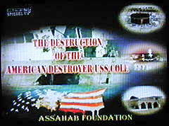 Anmerkung: Auf der CD, die ins Bild schwebt, ist zu lesen: 'Zerstörung des amerikanischen Zerstörers USS Cole' und 'Assahab Foundation'. Im Text ist von einem Band die Rede. Gezeigt wird uns aber offensichtlich eine CD. |