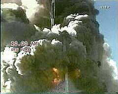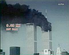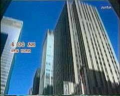 In den Nordturm des World Trade Centers schlägt die Maschine von Flug AA11 ein. 4000 Juden - so führt arte weiter aus - seien an diesem Tag nicht zur Arbeit erschienen. Der Mossad habe sie tags zuvor gewarnt. |