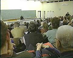 | Desweiteren wird Mathias Bröckers bei einer Vorlesung gezeigt. Er behaupte 6 der 19 angeblichen Attentäter seien noch am Leben. Deshalb müsse es sich bei den Ereignissen des 11. Septembers um einen Komplott handeln. Die Szene im Hörsaal endet mit einer Zeitrafferszene, die Mathias Bröckers als Hampelmännchen erscheinen läßt, kommentiert mit den Worten "Und so geht es noch stundenlang." 'arte' fällt offensichtlich immer weniger ein und entlarvt sich wieder einmal selbst. 'arte' geht es nicht um den Austausch von Argumenten, sondern um Diskriminierung. |