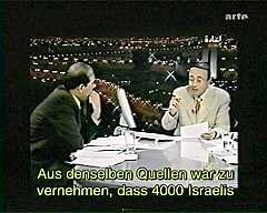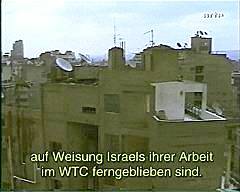 arte zeigt Szenen mit folgender Einblendung: "Aus denselben Quellen war zu vernehmen, dass 4000 Israelis auf Weisung Israels ihrer Arbeit im WTC ferngeblieben sind."