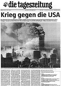Gerhard Paul schreibt: "Nur wenige Medien entzogen sich der herrschenden Logik und verweigerten sich der Komplizenschaft." Und dann behauptet er: "Hierzu zählten in Deutschland Zeitungen wie die 'tageszeitung' und 'Jungle World', die auf ihren Titelseiten bewußt auf die spektakulären Bilder vom Einschlag des zweiten Flugzeugs verzichteten..." Sehen wir uns die Titelseite der 'tageszeitung' vom 12.9.2001 an. Keineswegs läßt sich behaupten, sie würde aus der nazu gleichgeschalteten Presselandschaft ausscheren. 'Krieg gegen die USA' titelt die 'taz' und fährt damit auf der gleichen Schiene wie der 'Express'. Und sie zeigt sehr wohl ein Bild, das denen auf den Titelseiten der meisten anderen Zeitungen in nichts nachsteht. Das ist an diesem Tag auch keine Ausnahme. Wie wir immer wieder feststellen müssen, ist die 'taz' bei weltpolitisch entscheidenden Fragen im wesentlichen auf Linie.
