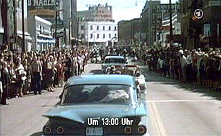 Und dann präsentiert Huismann eine weitere Einblendung aus dem angeblich abgehörten Telefonat, das um 14 Uhr unter Beteiligung der kubanischen Botschaft in Mexiko geführt worden sein soll: "Drei Kopfschüsse! - Perfekt". Die ARD liefert eine ganz neue Darstellung der Ereignisse. Von drei Kopfschüssen ist bislang noch nirgends die Rede gewesen. Selbst der Warren-Report (siehe unten), der die Art der Schüsse verschleiert, kennt nur einen Kopfschuß. Parallel zu den Texten aus den angeblichen Telefonaten, über deren Authentizität wir nichts wissen, sehen wir die Szene von der Ermordung John F. Kennedys. Wir sehen seine Limousine fahren. Nur haben wir kaum eine Chance zu erkennen, was genau passiert - wie und von wo Kennedy getroffen wird. Das wird in diesem Film auch an keiner anderen Stelle erhellt. Und es ist offensichtlich auch nicht beabsichtigt. Es ist Oliver Stone vorbehalten, uns diese Szene in dem 1991 entstandenen Film 'JFK' äußerst prägnant vorzuführen: