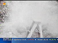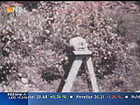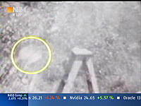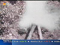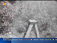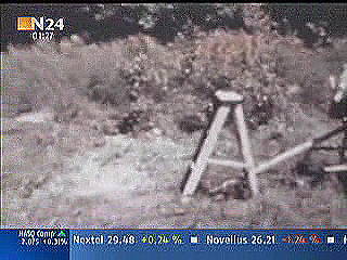 Nun wird die Szene nochmal wiederholt. Wieder macht es Puff. Eine helle Rauchschwade entsteht und läßt alles Wesentliche verschwinden. Aber dann wird im anhaltenden, weißlichen Dunstschleier so etwas wie ein Schädel sichtbar (mit einem gelben Kreis markiert). Aber wo befindet sich das Objekt, das ein Schädel sein soll? Etwa in Höhe der Fläche auf dem Schemel, auf dem vor dem Schuß der Schädel lag. Aber was ist das für eine Position, wo der Schädel zu sehen ist? Der Boden in der näheren Umgebung des Schemels befindet sich gar nicht im Blickfeld der Kamera. Das hat uns die Weitwinkelaufnahme der vorangegangenen Szene gezeigt. Entweder ist der Schädel sehr weit weg geflogen - vom Betrachter aus gesehen hinter den Schemel bzw. aus Richtung des angeblichen Schützen aus gesehen nach links. Aber - soweit das bei dem verschleierten Bild zu beurteilen ist - ist an der Position des Objekts mit dem gelben Kreis gar kein Boden, sondern Buschwerk. Dann hätte sich der Schädel also im benachbarten Buschwerk verfangen. Und er scheint dabei sogar größer geworden zu sein. Oder: vielleicht ist das gar nicht die Endposition des Schädels, die wir da sehen. Vielleicht sehen wir den Schädel im Flug, und das Bild mit dem gelben Kreis ist eingefroren. All das ist nicht zu beurteilen. Es ist möglich, physikalische Gesetze außer Kraft zu setzen - lernen wir. Die Krafteinwirkung auf den Schädel wird kompensiert - nein mehr als das. Die Kraft entgegen der Schußrichtung übertrifft sogar die in Schußrichtung wirkende Kraft. Sonderbar! Woher soll diese Kraft kommen? Eine Kraft aus dem Nichts! Erklärung: Fehlanzeige! Fragen über Fragen: