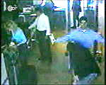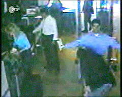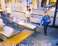 "5:45 Uhr: Auf insgesamt drei Flughäfen an der Ostküste passieren 17 weitere junge Araber in Geschäftskleidung die Sicherheitskontrollen." So heißt es im 'Protokoll des Grauens' kurze Zeit später. Es ist erstaunlich, was der Autor des Films alles weiß. Er weiß also von insgesamt 19 Arabern. Alle sollen sie um 5:45 Uhr die Sicherheitskontrollen passiert haben (obwohl wir eben in Zusammenhang mit Flug 77 noch gerade erfahren hatten, daß zwei von ihnen um 7:29 Uhr kontrolliert worden sein sollen). Und alle haben sie angeblich Geschäftskleidung getragen, obwohl die von Sicherheitskameras aufgenommenen Bilder die als Terroristen deklarierten Personen ohne derartige Kleidung zeigen. Ob sie ein Sacko getragen und bei der Kontrolle abgelegt haben, wissen wir nicht. Eindeutig läßt sich aber feststellen: die Personen tragen keine Krawatte. Und ein Rollkragenpullover gilt gemeinhin auch nicht als Geschäftskleidung. Vergleichen wir auch in diesem Fall die Bilder der Sicherheitskamera auf dem Flughafen mit denen, die das FBI mit der Behauptung in die Öffentlichkeit gebracht hat, es handele sich dabei um Personen, die die Flugzeuge entführt hätten.