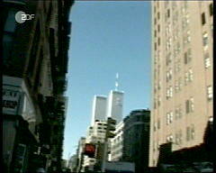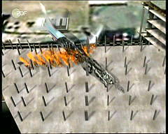 Desweiteren zum Vergleich noch eine Videoaufnahme aus dem Film 'Loose Change': hier sehen wir von unten, wie das Flugzeug in den Südturm fliegt. Wie im 'Protokoll des Grauens' verschwindet das Flugzeug im Turm wie in Butter, fast ohne in der Fassade des Gebäudes Spuren zu hinterlassen, und ohne daß (leichtere) Teile des Flugzeugs von der Fassade und den darin senkrecht verlaufenden Stahlträgern aufgehalten und zurückgeschleudert würden. Es ist, als wären die Stahlträger nicht vorhanden (ähnlich wie es im Fall des Anschlags auf das Pentagon in der Simulation von Prof. Sozen - die mit einem Stahlgitter verstärkte Außenwand ignorierend - zu sehen ist)
