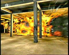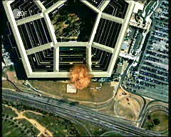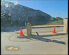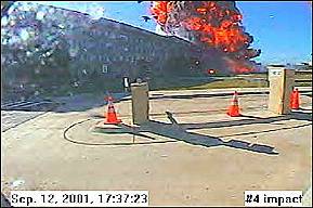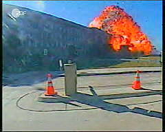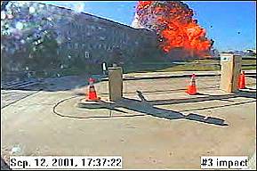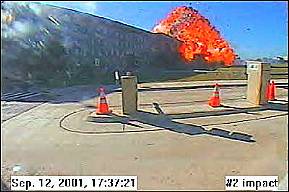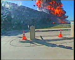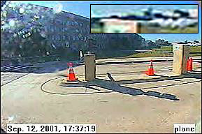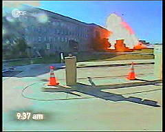 Hier ist der Fremdkörper unter dem Rumpf des Flugzeugs wieder deutlich erkennbar, so daß wir zu dem Schluß kommen müssen, daß es sich kaum um eine normale Boeing 767-222 der United Airlines handeln kann. Anschlag auf das Pentagon Das Thema 'Anschlag auf das Pentagon' wird mit einer Reihe von Aufnahmen einer Sicherheitskamera eingeleitet. Sie sollen am 11.9.2001 - wie wir der Einblendung in den Bildern in der linken Spalte entnehmen - um 9:37 Uhr entstanden sein.