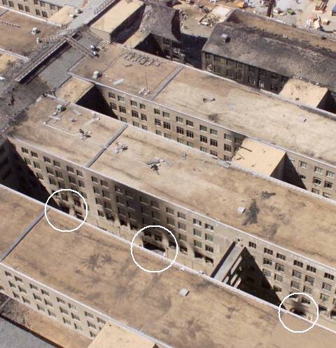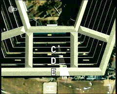 Weiter das 'Protokoll des Grauens': "American 77 bricht durch den äußersten, den Ring E des Pentagon, und durchbohrt eine Wand aus Stahlbeton nach der anderen. Der Rumpf bricht auseinander, als das Flugzeug Ring D und C durchstößt. Mehr als 100 Meter tief dringt es in das Gebäude ein. Feuerbälle prallen gegen die Wände der Korridore." Die Bilder der Simulation zeigen allerdings keine Wände (aus Stahlbeton), sondern Säulen (auch auf der Außenseite des Gebäudes, wo sich tatsächlich eine mit einem Stahlgeflecht gestärkte Außenwand befand, mit der das Pentagon noch kurz vor dem Anschlag zur Steigerung der Sicherheit gegen einschlagende Objekte versehen worden war). Das vierte Bild (mit dem schmäler werdenden Pfeil) legt nahe anzunehmen, es gäbe nur ein Objekt, das die Gebäuderinge an einer Stelle durchschlagen hat. Das ist aber nicht der Fall, wie die folgende Luftaufnahme zeigt:
