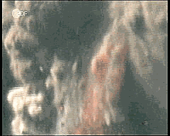 In der bei 'Loose Change' wiedergegebenen Szene beträgt die Zeitspanne vom Erscheinen des Flugzeugs im Bild bis zur Kollision etwa 12 Bilder, d.h. etwa eine halbe Sekunde. Es ist also insbesondere der Zeitraum wiedergegeben, in dem das 'Protokoll des Grauens' die Veränderungen am Rumpf des Flugzeugs offenbart. Sie müßten demnach auch in dieser Aufnahme zu sehen sein. Das ist aber nicht der Fall. Warum, ist unklar. Wir wissen nicht, ob es sich bei diesem Video um eine manipulierte Aufnahme handelt. Es ist eine Aufnahme, die die Unterseite des Flugzeugs deutlich und aus relativ geringer Distanz zeigt. In 12 Bilder verändernd einzugreifen, wäre mit keinem nennenswerten Aufwand verbunden. Betrachten wir zum Schluß noch eine weitere Videoaufnahme. Sie ist kurz vor der Kollision des Flugzeugs mit dem Gebäude kurz angehalten. (ein Hinweis dazu: das Videomaterial enthält jedes Einzelbild mehrfach. Es handelt sich also um eine Zeitlupenaufnahme. Die Einzelbild-Wiederholungen sind in die hier vorliegende Animation nicht eingeflossen)