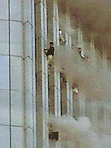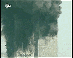 Und auch die Behauptung, es hätten Temperaturen von mehr als 1000°C geherrscht, ist unrealistisch. Die Bilder zeigen Menschen, die sich an die Außenfassade klammern. Sie wären längst verschmort, wenn dort tatsächlich annähernd die behaupteten Temperaturen geherrscht hätten. Einsturz des Südturms Das 'Protokoll des Grauens' zeigt, wie der Turm absolut senkrecht in sich zusammen sinkt - mit Fallgeschwindigkeit - wie bei einer kontrollierten Sprengung. Und der Film zeigt die Staubwolken, wie sie nach außen getrieben werden - wie bei einer Sprengung. Erstaunlich ist zudem, daß die Senkrechtbewegung zustande kommt, obwohl zunächst der obere Teil des Turms in Richtung Kamerastandpunkt zu kippen begonnen hatte. Das scheint nur möglich, wenn das Gebäude unterhalb des kippenden Teils plötzlich weggesackt ist.