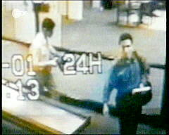 Dann sehen wir eine Aufnahme, die gemäß Einblendung gegen 5:45 Uhr entstanden sein und angeblich die als Terroristen bezeichneten, Mohammed Atta und Abdul Asis al Omari genannten Personen zeigen soll (auf dem Weg nach Boston, wo sie in Flug 11 der American Airlines umgestiegen sein sollen). Und der Kommentar-Sprecher sagt dazu: "Zwei Minuten später nimmt sie diese Sicherheitskamera auf. Hier tragen sie keine Krawatten und Sackos mehr."