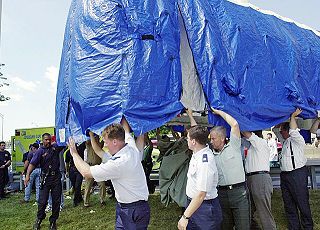 Dies ist ein Motiv, das auch im Film 'Loose Change' gezeigt wird und damit Gegenstand kontroverser Diskussionen geworden ist. In 'Loose Change' heißt es dazu: "Und Angestellte am Pentagon wurden gesehen, wie sie eine große Box wegtrugen, die in eine große Plane gehüllt war. Warum diese Geheimnistuerei?" Eine Vielzahl von websites (internetdetectives.biz, 911research.com, www.loosechangeguide.com, www.infokrieg.tv) bemühen sich, das Bild zu bagatellisieren. Sie tun dies, indem sie Bilder vom Gelände vor dem Pentagon zeigen, auf dem eine Reihe von Zelten mit Planen teilweise der gleichen Farbe zu sehen sind, und dann behaupten, was auf dem Bild getragen werde, sei ein Zelt. "Das blaue Objekt ist ein Zelt und nicht etwa eine Box mit mysteriösen Flugzeugteilen", heißt es auf einer der websites (www.infokrieg.tv), als wenn das in irgendeiner Weise überzeugend wäre - als wenn klar wäre, daß die Abmessungen des getragenen Objekts mit denen eines der vor dem Pentagon aufgebauten Zeltes übereinstimmen würden und sich hinter der Plane nichts verbergen könnte. Es ist Gerhard Wisnewski zu gute zu halten, daß er sich von solch durchsichtiger Pseudoargumentation nicht irritieren läßt. Ja, es kann ein Zelt sein, aber in dem Zelt kann sich genau dasjenige Objekt befinden, das im Verborgenen bleiben soll. Operation 9/11 - Manöver 9/11 'Verschlußsache Terror' schildert plastisch die Situation am Tag der Anschläge von New York und Washington: "11. September 2001, gegen 8.00 Uhr. [...] Am Himmel ist die Hölle los. Mehrere große Airliner wurden von Hijackern entführt, sind von ihrem Kurs abgewichen und vagabundieren nun unkontrolliert durch den Luftraum der USA. Normalerweise würde sofort jemand zum Telefon greifen, um die Luftwaffe zu alarmieren [...] Aber an diesem schönen Septembertag des Jahres 2001 bewahren die NORAD-Fluglotsen absolute Ruhe. [...] Die Controller bleiben gelassen, weil das Ganze nur eine Übung ist. Gott sei Dank. Ihr Name: Vigilant Guardian." Gerhard Wisnewski spricht von mehreren Manövern mit entführten Flugzeugen, die am 11.9. dafür sorgten, "daß die Abwehrsysteme nicht wie üblich reagierten - weil die Verantwortlichen der Meinung waren, bei den vom Kurs abgewichenen Maschinen habe es sich lediglich um einen Teil einer Übung gehandelt." Die Manöver hätten auch einen optimalen Deckmantel geboten, um Verkehrsmaschinen am Himmel gegen andere Flugzeuge auszutauschen - durch ähnlich aussehende, ferngelenkte Drohnen, die man durch Fernbedienung und/oder Programmierung sowie mit Hilfe von elektronischen Leitsystemen zielgenau in das World Trade Center führen konnte. "Der gesamte Militärapparat kann ganz offiziell seine Übung abwickeln - mit Tausenden von Beteiligten. Verschwörer braucht man im Militär nur sehr wenige, vor allem zwei Piloten, die plötzlich 'ausflippen' und ihre Drohnen in das World Trade Center fliegen lassen." Gerhard Wisnewski entwirft ein detailiertes Bild, was alles Teil des Manövers 9/11 gewesen sein könnte: