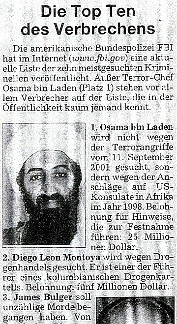 Osama bin Laden ist nicht wegen der Anschläge vom 11. September 2001 gesucht. Auf diese von der 'Süddeutschen Zeitung' beiläufig gemachte Mitteilung können wir uns hier beschränken. Das bedarf keines Kommentars. Dank an FBI und 'Süddeutsche'! |