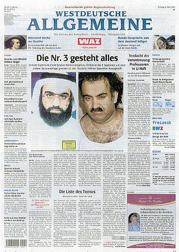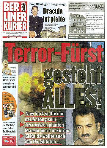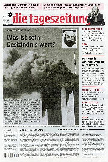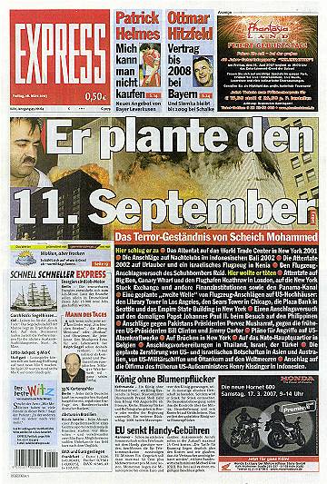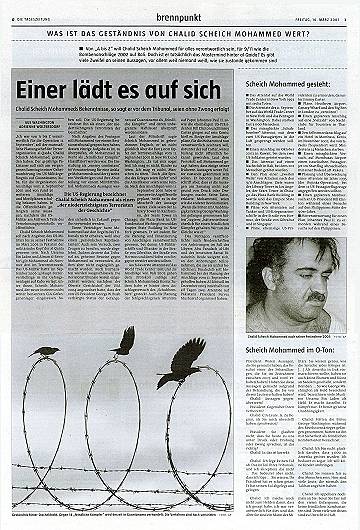 Während ein großer Teil der Presse das Pentagon-Geständnis im Sinne des Pentagon präsentiert, geht die 'taz' vom 16.3.2007 so weit zu fragen, "ob jene 'Anhörung' vor einem Militärtribunal in Guantanamo, deren Protokoll das Pentagon am Mittwochabend veröffentlicht hat, überhaupt je stattgefunden hat. Außer Militärangehörigen - deren Namen im Protokoll gestrichen sind, die also niemand befragen kann - war niemand dabei: kein Anwalt, kein Reporter, nicht einmal ein Familienangehöriger. Das Vorgehen des Pentagons ist eine Farce." Im 'Neuen Deutschland' wird kommentiert: "Zusammen mit Scheich Mohammed rückte Bushs Unrechtsjustiz wieder so recht ins Rampenlicht. Dazu kommt, dass der plötzlich redselige Dämon, der nichts mehr zu verlieren hat, nun erst recht von seinen Anhängern als Märtyrer gesehen wird. Je mehr er erzählt, desto größer wird deren terroristischer Eifer sein. Dabei hat er das Wichtigste noch nicht mal ausgepackt - dass er nämlich selber bin Laden ist. Man müsste ihm nur einen langen Bart ankleben, dann könnte es jeder sehen." |