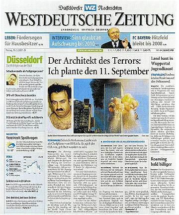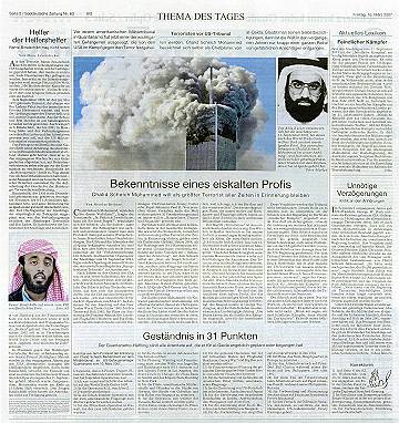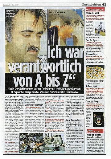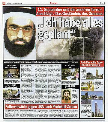 Der Gedanke dagegen, das so genannte Geständnis und die Scheich Mohammed genannte Person könnten Phantasieprodukte des Pentagon oder einer anderen Behörde sein, soll nicht aufkommen. Die Chronologie der Ereignisse April 2002: in diesem Monat will der Londoner Chefkorrespondent des arabischen Fernsehsenders al-Dschasira, Yosri Fouda - so behauptet dieser - im pakistanischen Karatschi ein Interview mit Ramzi Binalshibh und Chalid Scheich Mohammed, die er als als Masterminds der Anschläge vom 11. September bezeichnet, geführt haben (arbeiterfotografie.com) September 2002: kurz vor dem 11.9.2002, dem ersten Jahrestag des 11. September, wird bei al-Dschasira eine Sendung mit Tonaufnahmen ausgestrahlt, die aus dem Interview mit Ramzi Binalshibh und Chalid Scheich Mohammed stammen sollen 11.9.2002: an diesem Tag soll in Karatschi eine Person mit dem Namen Ramzi Binalshibh verhaftet worden sein 11.9.2002: an diesem Tag soll (gemäß einer Veröffentlichung der in Hongkong erscheinenden 'Asia Times' vom 30.10.2002) bei einer Razzia in Karatschi eine Person namens Chalid Scheich Mohammed ums Leben gekommen sein (Asia Times) 1.3.2003: an diesem Tag sollen in Rawalpindi (nahe der pakistanischen Hauptstadt Islamabad) zwei Personen namens Chalid Scheich Mohammed bzw. Ahmed Abdul Qudoos (auch 'Quddus' geschrieben) festgenommen worden sein (The Tribune) 10.3.2003: der pakistanische Geheimdienst ISI präsentiert im Rahmen einer Pressekonferenz Videoaufnahmen, die angeblich die Verhaftung einer Person namens Chalid Scheich Mohammed am 1.3.2003 zeigen (Telegraph) 26.10.2003: Spiegel-TV strahlt einen Beitrag mit dem Titel 'Die Geständnisse der Terroristen' aus, in dem Szenen gezeigt werden, von denen behauptet wird, daß sie die Verhaftung von Ramzi Binalshibh (am 11.9.2002) und Chalid Scheich Mohammed (1.3.2003) zeigen (arbeiterfotografie.com) 15.3.2007: Vom US-Verteidigungsministerium wird ein Text verbreitet, von dem behauptet wird, daß darin Äußerungen von Chalid Scheich Mohammed enthalten seien, mit denen dieser im US-Lager Guantanamo ein Geständnis ablege, die Anschläge vom 11.9.2001 und weitere Anschläge geplant zu haben Was die Presse über das Pentagon-Gestandnis veröffentlicht:
