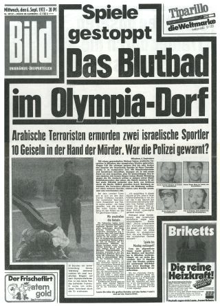 Das folgende Zitat aus dem „stern“ vom 17.9.1972 erinnert an den Küstenstraßenanschlag: „Kein einziger Polizist aber stand vor dem Quartier der israelischen Olympiamannschaft, obwohl [der Münchner Polizeipräsident Dr. Manfred] Schreiber später zugab, dass auch nach seiner Ansicht die Israelis 'zu der Gruppe gehörten, die am meisten gefährdet waren'. Schreibers Begründung für den fehlenden Schutz: 'Die israelische Seite hatte unser Angebot abgelehnt.' Pro Israeli hatte man einen deutschen Sicherheitsbeamten abstellen wollen. Doch die Israelis winkten ab: 'Lassen Sie, das machen wir selbst'.“ Was ist in diesem Fall die Reaktion und Folge? Der ehemalige Mossad-Agent Victor Ostrovsky schildert, wie Israel drei Tage später „reagierte“: „...mit dem Befehl an 75 Bomber, Guerillastellungen - so behauptete man - in Syrien und Libanon zu bombardieren. Es waren die schwersten Luftangriffe seit 1967, und sie forderten 66 Tote und unzählige Verwundete.“ „Das Olympia-Attentat sowie die Reaktion Israels [waren] ein entscheidender Moment in der Geschichte des Nahen Ostens“, sagt Steven Spielberg in Zusammenhang mit seinem Film „München“, der die „Rache Israels – Die Rache Gottes“ - thematisiert und 2005 in die Kinos kam. Oliver Schröm: „Unter dem Codenamen 'Die Rache Gottes' jagte und ermordete der Mossad die Hintermänner des Attentates. [...] Ermächtigt durch den Beschluss von [Israels Premierministerin] Golda Meir schlug der israelische Geheimdienst umgehend zurück. Zuerst ermordete ein Killerkommando des Mossad den Leiter des Schwarzen September... In der gleichen Nacht bombardierten israelische Hubschrauber noch das Hauptquartier der PFLP und zwei Waffenlager der Al Fatah am Rande von Beirut... Danach ging es Zug um Zug. Mitglieder des Schwarzen September waren nirgendwo mehr sicher. Der Mossad stöberte sie auch in Paris und Rom auf und liquidierte sie...“ Es wird klar: Die staatsterroristische Praxis des so genannten „gezielten Tötens“ wird der Öffentlichkeit in einem Maße als adäquates Mittel eingepflanzt, wie es extremer kaum denkbar ist. Die wohl wichtigste Ebene dessen, was mit dem Attentat erreicht wurde, benennt Andreas von Bülow: „Bei keiner anderen Gelegenheit hätte einer in die Hunderte von Millionen gehenden Fernseh-Zuschauergemeinde in aller Welt live dargestellt werden können, dass mit den Verantwortlichen eines Volkes, die friedliche Sportler bei Olympischen Spielen überfallen und kaltblütig ermorden, ein Friede nicht zustande kommen kann.“ Mit anderen Worten: Die in Israel herrschenden Kräfte sind dem Ziel, den Frieden zu verunmöglichen, ein entscheidendes Stück näher gekommen. Das Olympia-Attentat vom 5. September erinnert an den 11. September. Der Satz von Golda Meir „Es war wunderbar, wir haben die Mörder getötet, die schon neue Attentate planten.“ erinnert an die Hetzreden von George W. Bush zur Rechtfertigung des verbrecherischen „Kriegs gegen den Terror“. Staatliche Verbrechen konnten in der Folge als Racheakt deklariert werden. Der so genannte Friedensprozess wurde sabotiert. False Flag? Ja oder Nein? USA, 2001 Am 11. September 2001 ereigneten sich die Anschläge von New York und Washington, die die Weltpolitik einschneidend verändert haben. Etwa 3000 Menschen kamen dabei zu Tode.