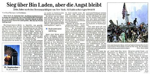 New York. 11. September 2001 - das Datum markiert ein neues Kapitel der Weltpolitik. Der Terror islamistischer Gotteskrieger wurde zur globalen Bedrohung. Zehn Jahre danach ist AI Kaida geschwächt, Osama bin Laden getötet. Aber hat der Westen damit gesiegt? Das Grauen konnten Millionen Menschen rund um den Globus live miterleben. Doch das, was sich vor ihren Augen abspielte, war derart unfassbar und monströs, dass es die meisten Fernsehzuschauer anfangs nicht verstanden. Selbst die engsten Sicherheitsberater des amerikanischen Präsidenten brauchten eine Weile, um zu begreifen, was geschah. Dann flüsterten sie George W. Bush die Worte ins Ohr, die nur Minuten später ebenfalls um die Welt gingen. "America is under attack!" Amerika wird angegriffen! Es war der 11. September 2001 - politisch gesehen begann das 21. Jahrhundert mit diesem Tag. Der Tag, an dem islamistische Gotteskrieger mit entführten Flugzeugen die Zwillingstürme in New York zum Einsturz brachten, markiert eine politische Zeitenwende. Erstmals in ihrer Geschichte wurden die USA von einem Feind tief im eigenen Land getroffen. Islamistischer Extremismus versetzte die Welt in Angst. „Kein anderes Ereignis seit Beginn des Kalten Krieges hatte eine derart verändernde Wirkung auf die amerikanische Politik wie der 11. September", urteilt zehn Jahre danach der unabhängige US-Experte Jacob Heilbrunn. Ob für Bush oder seinen Nachfolger Barack Obama - der Kampf gegen den Terror wurde zur bestimmenden Richtschnur der US-Politik. Die Antwort auf das Grauen kam prompt: Aus den Trümmern des World Trade Center stieg noch der Rauch auf, als Bush den Terroristen den Krieg erklärte. "Wir werden die Welt zum Sieg führen", sagte er. Bush antwortet mit Krieg Kaum einen Monat später griffen US-Truppen Afghanistan an, im Frühjahr 2003 den Irak. Global und prompt waren die weltweiten Reaktionen: Erstmals in ihrer Geschichte löste die Nato den "Bündnisfall" aus. Die Anschläge der Terroristen seien ein Kriegsakt - alle Nato-Mitglieder müssten Beistand leisten. Eine Welle des Verständnisses für die USA ging um die Welt. Für die Deutschen war es der erste echte Kriegseinsatz - bislang starben über 50 deutsche Soldaten. Während der Afghanistan-Einsatz auf Verständnis stieß, löste die US-Invasion im Irak vor allem in Westeuropa Ablehnung und Proteste aus. Dass die Deutschen sich dem Waffengang entzogen, führte zu einem der schwersten Konflikte zwischen Washington und Berlin. Bush duldete keine Abweichler: „Jede Nation muss sich entscheiden: Entweder seid ihr auf unserer Seite oder auf der Seite der Terroristen." Auch das war ein neuer Tonfall unter Verbündeten. Spürbar bis heute sind die „Kollateralschäden": Folter, Entführungen, Geheimgefängnisse - die Bush-Regierung scheute im „Krieg gegen den Terror" vor nichts zurück. Sinnbild des politischen Sittenverfalls ist das Gefangenlager Guantänamo auf Kuba, das Obama schließen wollte. Einen „permanenten Ausnahmezustand" nennt das der US-Bürgerrechtler Ben Wizner. Die Bilder vom 11. September 2001 wirken noch heute gespenstig irreal: Als das erste Flugzeug hoch über den Köpfen der New Yorker einschlug, rannten die Menschen in den Zwillingstürmen um ihr Leben. Kaum eine Stunde später raste ein weiteres entführtes Passagierflugzeug ins Pentagon, dem US-Verteidigungsministerium vor den Toren Washingtons. Eine vierte entführte Maschine stürzte in der Nähe von Pittsburgh in ein Feld. Rund 2800 Menschen starben in New York, 184 bei der Pentagon-Attacke und 40 Passagiere sowie Besatzungsmitglieder beim Absturz nahe Pittsburgh. Seit dem Bürgerkrieg waren nicht mehr so viele Amerikaner an einem Tag im eigenen Land gewaltsam ums Leben gekommen. Auch die 19 Attentäter starben. Gleich mehrere hatten zuvor als Studenten in Hamburg gelebt. Zehn Jahre nach 9/11: Osama bin Laden, die Leitfigur terroristischer Islamisten, starb unlängst in den Gewehrsalven von US-Soldaten. Sein Terrornetzwerk AI Kaida gilt als geschwächt - seit Jahren konnte es keinen wirklich großen Coup landen. Und in Nordafrika und Nahost blüht seit Monaten der „arabische Frühling" - eine Volksbewegung, die für Demokratie und Freiheit kämpft. Von Forderungen nach Gottesstaat und Scharia-Recht dagegen keine Spur. Haben die USA damit die Konfrontation mit dem islamistischen Terrorismus gewonnen? Tatsächlich hatten sich nach dem 11. September die Attentate zunächst gehäuft - es traf Bali, Istanbul, Madrid, London. Längst ist es nicht mehr das Netzwerk AI Kaida, das zuschlägt, sondern es sind kleine isolierte Gruppen, die bestenfalls lose Verbindungen zu AI Kaida haben. „Doch wir packen es ganz offenbar richtig an", urteilt John Pike, Sicherheitsexperte in Washington. „Wir haben Bin Laden geschafft, in den USA gab es seit dem 11. September 2001 keinen größeren Anschlag." Auch weltweit gebe es seit Jahren deutlich weniger Anschläge. Als Bin Laden Anfang Mai von einer US-Spezialeinheit in Pakistan erschossen wurde, brach in den USA offener Jubel aus. Mitten in der Nacht liefen in New York und Washington Menschen auf die Straße - ein Zeichen, wie tief der Schock von 9/11 noch immer sitzt. Doch Skepsis ist angesagt, dass die tödliche Bedrohung tatsächlich vorbei ist. „Während die Bedrohung des Terrorismus möglicherweise niemals verschwinden wird", meint Heilbrunn, „so kann Amerika doch wenigstens aus der Konfrontation mit seinem gefährlichsten Gegner siegreich hervorgehen." (dpa)