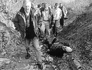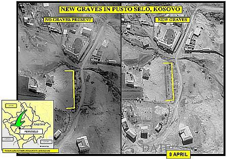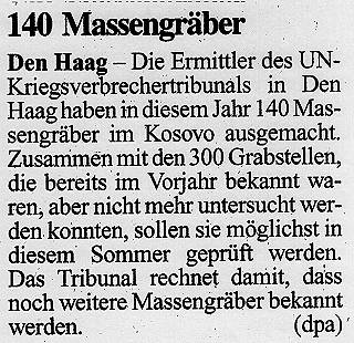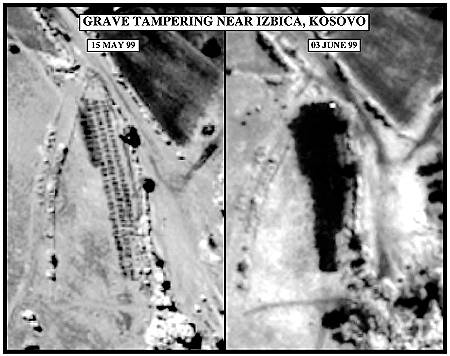 "Am 3. Juni zeigt dieses ... Bild etwas, was wie ein Gelände erscheint, auf dem ein Bulldozer zugange war. Das ist der schwarze Klecks hier." Mit diesen Worten wird am 9. Juni 1999 im Rahmen einer Pressekonferenz des US-Verteidigungsministeriums noch einmal ein Bild des angeblichen Massengrabgeländes bei Izbica vorgestellt. (3) Allmählich haben die Massengrab-Aufnahmen ihre Wirkung erfüllt. Der Krieg, den sie zu legitimieren geholfen haben, neigt sich dem Ende zu. Wie James Harff sagt: Spätere Dementis sind völlig unwirksam. Dennoch ist es aufschlußreich, ein Jahr nach Kriegsende einen weit abgeschlagen winzigen Artikel zu lesen. (4)