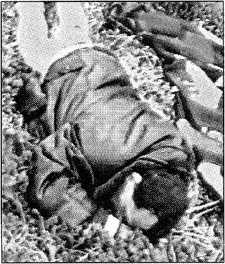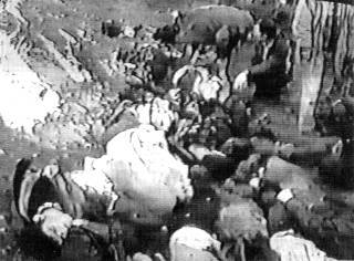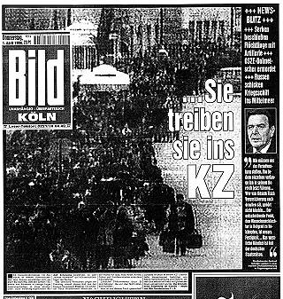 Wie der überwiegende Teil der Medien greift auch 'Bild' auf die Erfindung der PR-Agentur Ruder Finn zurück, Begriffe aus der Zeit des Nationalsozialismus auf 'Die Serben' anzuwenden: Völkermord, Ethnische Säuberungen, Konzentrationslager... Das Bild 13 beweist nichts dergleichen, auch wenn es von den Gestaltern der Bildzeitung fast auf Seitengröße aufgeblasen ist. Es ist fast nichts zu erkennen. Aber im Kontext entfaltet es seine Wirkung. "Leichen, überall Leichen. Erschossene Männer, deren Gesichter mit Baseballschlägern verstümmelt wurden, damit sie niemand identifizieren kann. Bilder des Grauens, Bilder aus dem Kosovo. Verteidigungsminister Rudolf Scharping zeigte sie gestern, um eindringlich zu belegen: So grausam wütet Serben-Führer Milosevic. Deshalb dieser Krieg: Das Massenmorden muß ein Ende haben." So 'Express' vom 28.4.1999 - in gekonnter Weise gestaltet - auf seiner Titelseite. (14)