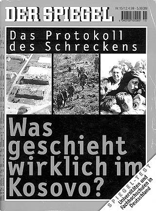 Zwar suggeriert auch dieser Artikel immer noch die erwiesene Existenz einer großen Anzahl von Massengräbern. Aber genaues Lesen besagt das Gegenteil. 'Der Spiegel' am 29.3.1999: "Der Serben-Zar drangsaliert seine albanischen Schutz-befohlenen im Kosovo mit Repressionen, Vertreibung und Morden wie Mitte Januar beim Massaker an 45 Bewohnern des Dorfes Racak. 'Wenn Milosevic keinen Frieden will', drohte Menschenrechtler Clinton, 'dann sind wir entschlossen, ihn am Kriegführen zu hindern.'" Im Bericht der OSZE heißt es zu den Ereignissen in Racak klar: "Die Opfer wurden hingerichtet, viele aus allernächster Nähe erschossen." "Am Freitag [15.1.1999], ein Tag, bevor das Massaker bekannt wurde, machte Außenministerin Madelaine K. Albright darauf aufmerksam, das brüchige Kosovo-Abkommen ... sei dabei zu zerbrechen, so ein Beamter der Administration. Frau Albright sagte dem Weißen Haus, dem Pentagon und anderen Behörden, die Administration stehe im Kosovo vor einem Augenblick der Entscheidung, so der Beamte." (New York Times, 19.1.1999) Was deutet die US-Außenministerin an, wenn sie sagt, das Abkommen sei dabei zu zerbrechen und es stehe ein Augenblick der Entscheidung bevor? Der 'Spiegel' am 25.1.1999 in der Überschrift zu einem groß aufgemachten Artikel: "Nach dem Massaker an Albanern im Dorf Racak ist die NATO zum Eingreifen bereit." Was damit klar wird: Es bedurfte eines Auslösers, um NATO und Öffentlichkeit auf Krieg zu programmieren - das ist bei Kriegen immer so.