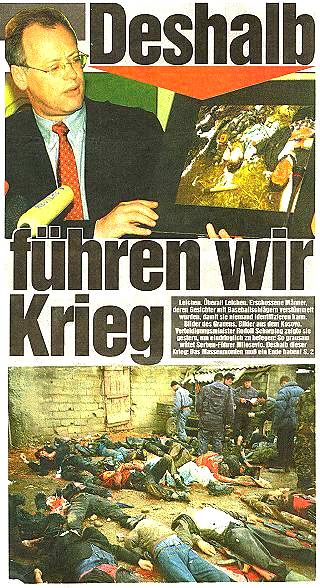 Was Bilder beweisen - über die Funktion von Bildern im Krieg gegen Jugoslawien Artikel von Andreas Neumann, August 2000, aus der Zeitschrift Arbeiterfotografie, Ausgabe 88 "'Die Bundesregierung' brauche 'Fakten über Greuel, besser noch Bilder von Grausamkeiten, die Milosevics Schergen begangen haben...' Verteidigungsminister Scharping beschwerte sich öffentlich, die NATO rücke nicht genügend Bilddokumente heraus. 'Ich hoffe, sie ändert das bald', so Scharping Mitte vergangener Woche, denn 'es ist auch eine Schlacht um Information und Propaganda.'" ('Spiegel', 12.4.99, S. 29) Die NATO reagiert schnell. Bereits am Sonntag, dem 11.4. präsentiert sie Bildmaterial von Massengräbern (veröffentlicht z.B. im 'Tagesspiegel' vom 13.4.99).