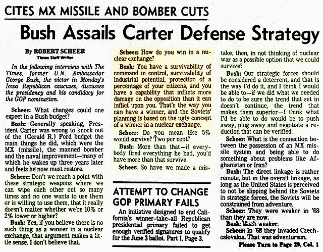 Bush: Ja, wenn man annimmt, daß es nicht so etwas wie einen Gewinner in einem Atomkrieg gibt, macht das Argument wenig Sinn. Ich glaube das nicht. Scheer: Wie gewinnt man einen Atomkrieg? Bush: Man muß die Überlebensmöglichkeit der Oberkommandos sichern, die Überlebensmöglichkeit eines Industriepotentials, man muß den Schutz einer gewissen Prozentzahl von Bürgern sichern und eine Kapazität von Waffen haben, die der Gegenseite mehr Schaden zufügt, als sie einem selber zufügen kann, das ist genau der Weg, auf dem man einen Sieger in einem Atomkrieg hat. Und die Planungen der Sowjets basieren auf dem häßlichen Konzept eines Gewinners in einem Atomkrieg. Scheer: Meinen Sie, etwa 5 Prozent würden überleben? 2 Prozent? Bush: Mehr als das - wenn jeder alles abfeuert, was er hat, hätte man mehr als das, die überleben. Scheer: Also haben wir einen Fehler gemacht, einen Atomkrieg als mögliche Option nicht in Betracht zu ziehen, da wir ja überleben könnten. Bush: Unsere strategischen Streitkräfte sollten als Abschreckung angesehen werden. Und das ist der Weg, den ich gehen würde. Und ich denke, ich wäre in der Lage - wenn wir tun, was wir notwendigerweise tun sollten, um sicher zu sein, daß der Trend, der eingesetzt hat, sich nicht fortsetzt, der Trend, der sie überlegen macht - ich denke, wozu ich in der Lage wäre, wäre abzudrängen, zu schuften und eine Verringerung auszuhandeln, die überprüfbar ist. Welche Brisanz die Vorstellungen, die er (unfreiwillig) hat offenbar werden lassen, haben, zeigt die Nachgeschichte. Im Rahmen einer Pressekonferenz Anfang Februar 1980 versucht er zu retten, was zu retten ist. Die 'Los Angeles Times' vom 6. Februar 1980 schreibt in einem Artikel mit dem Titel: "Bush Explains View on 'Winning' A-War" (Bush erläutert seine Sicht zum 'Gewinnen' eines Atomkriegs): "Der Reporter sagte, die Antworten Bushs auf Fragen des Times-Journalisten Robert Scheer würden implizieren, er habe von den Überlebensmöglichkeiten der USA gesprochen. 'Nein, darüber habe ich nicht gesprochen', erwiderte Bush scharf. 'Ich habe über die Sowjetischen Planungen gesprochen, die auf dem undenkbaren Ding eines Gewinners in einem Atomkrieg basieren.'" Es folgt dann ein Auszug aus dem Interview, beginnend mit "Don't we reach a point" und endend mit "ugly concept of a winner in a nuclear exchange". Der Auzug entspricht exakt dem Wortlaut des Interviews vom 24.1.1980. Es ist nichts verändert, hinzugefügt oder weggelassen.