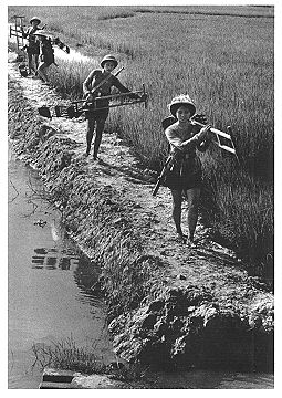 | 4 Arbeit zwischen Luftangriffen - Mädchen der Volksmiliz bestellen die Reisfelder, Vietnam, 1965 |