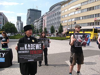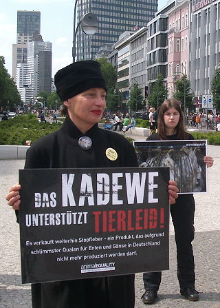 | Berlin, 8.6.2013 - "Das KaDeWe unterstützt Tierleid" - Aktion gegen den Verkauf von Stopfleber vor dem Kaufhaus des Westens |